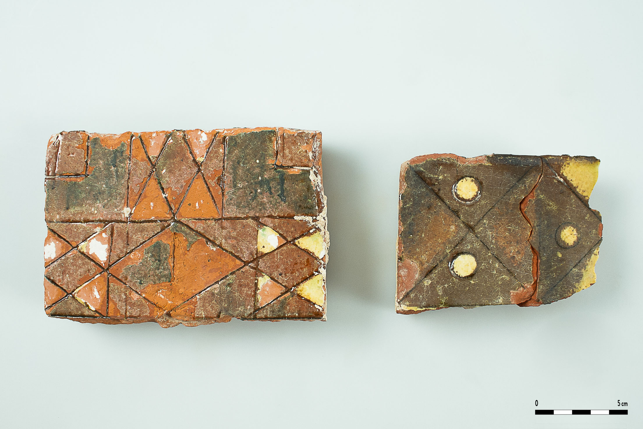 Détail d’un panneau de pavement qui ornait le sol de la crypte de l’église abbatiale gothique de Mont-Saint-Éloi. Fabriqué en terre cuite, ce panneau de pavement a été pré-incisé, engobé et glaçuré, mais pas découpé. Ce style de carreaux de pavement fait la transition entre les carreaux glaçurés vert olive et jaune du 13ième siècle et les carreaux estampés en "quart de couronne" du 15ième siècle. Vous pourrez l’observer en détail dans l’exposition " Apporter sa pierre à l’édifice. Archéologie de l’abbaye de Mont-Saint-Éloi".