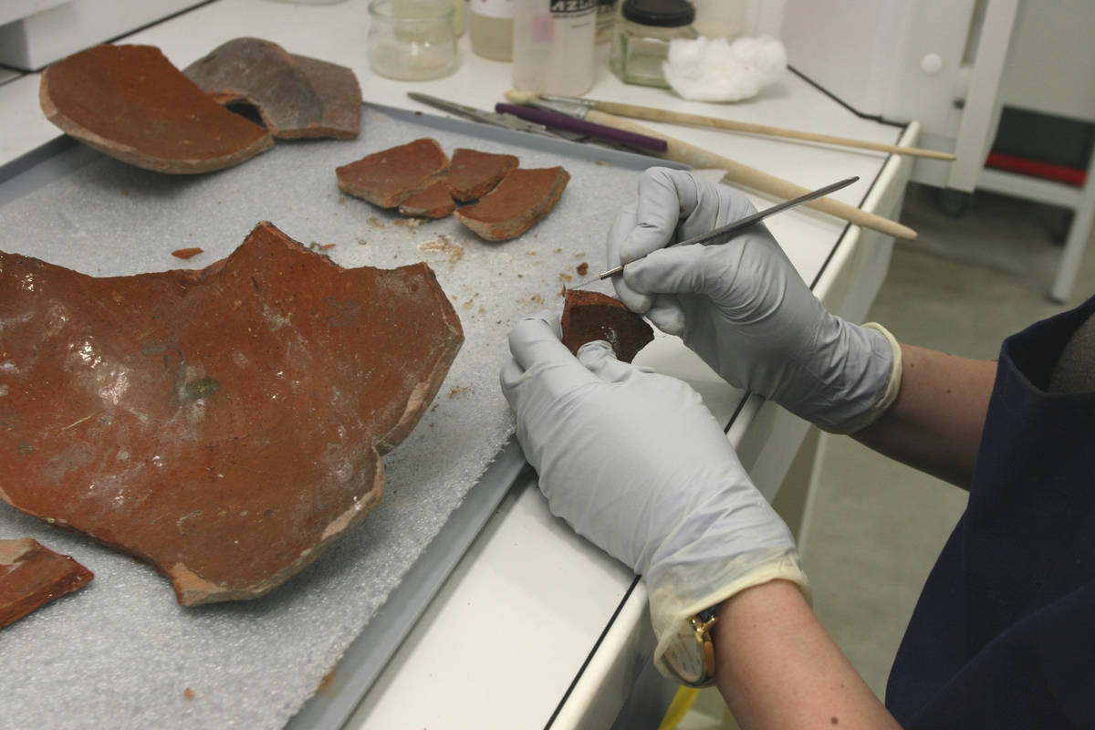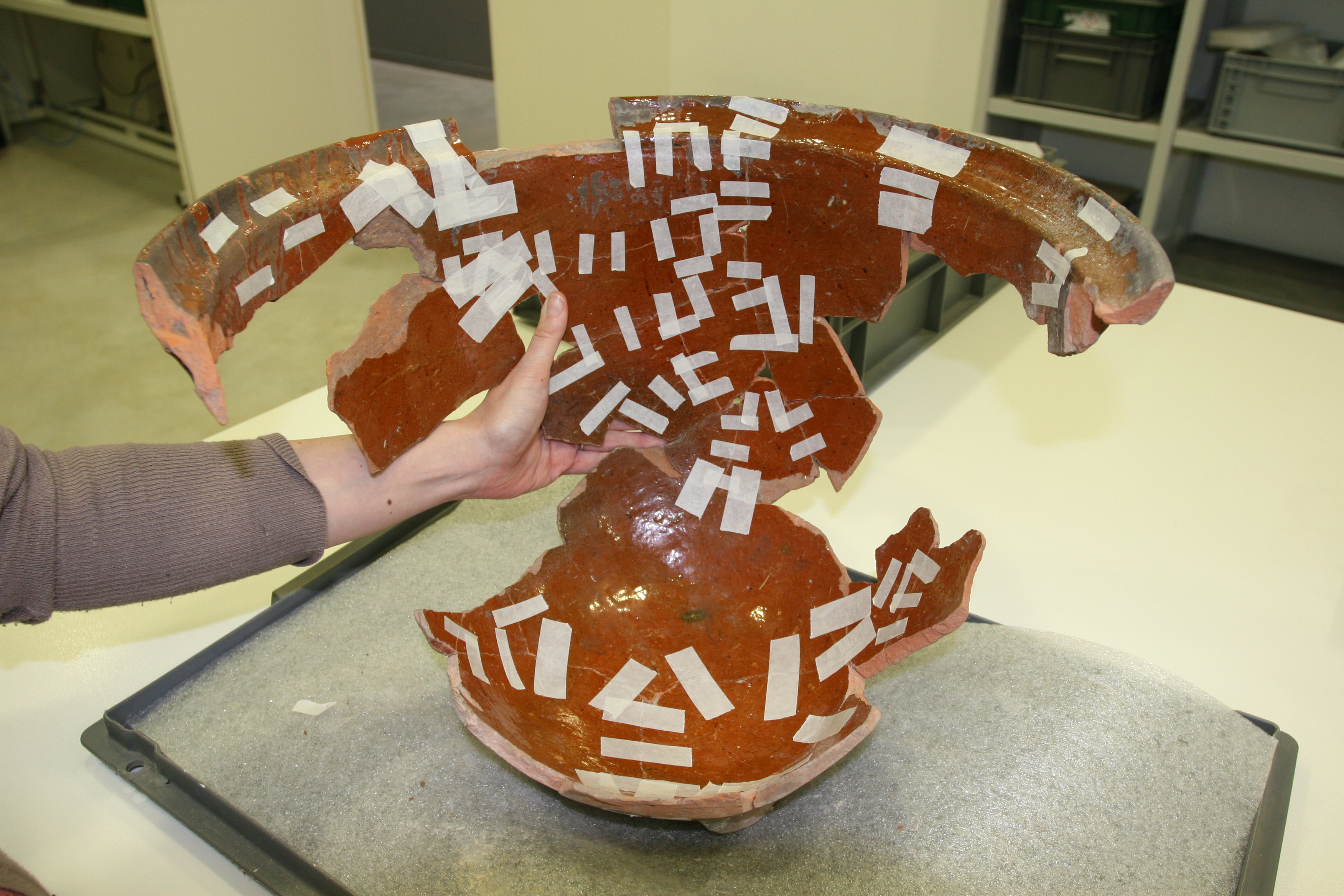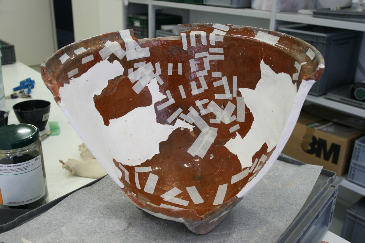 C’est entourée de scalpels, pinceaux, pipettes et flacons que Sandrine Janin-Reynaud nous accueille dans son laboratoire. Elle nous livre les secrets de la restauration du saloir de Bours mis au jour en 2012 lors d’un diagnostic effectué au Donjon de Bours, tour médiévale édifiée au 14e siècle. Ce grand vase en terre cuite du 15e - 16e siècle, avec une ouverture de 43 cm, était probablement utilisé pour contenir des salaisons de viande ou de légumes. Si la surface extérieure est brute, l’intérieur est vernissé pour assurer l’étanchéité du récipient.