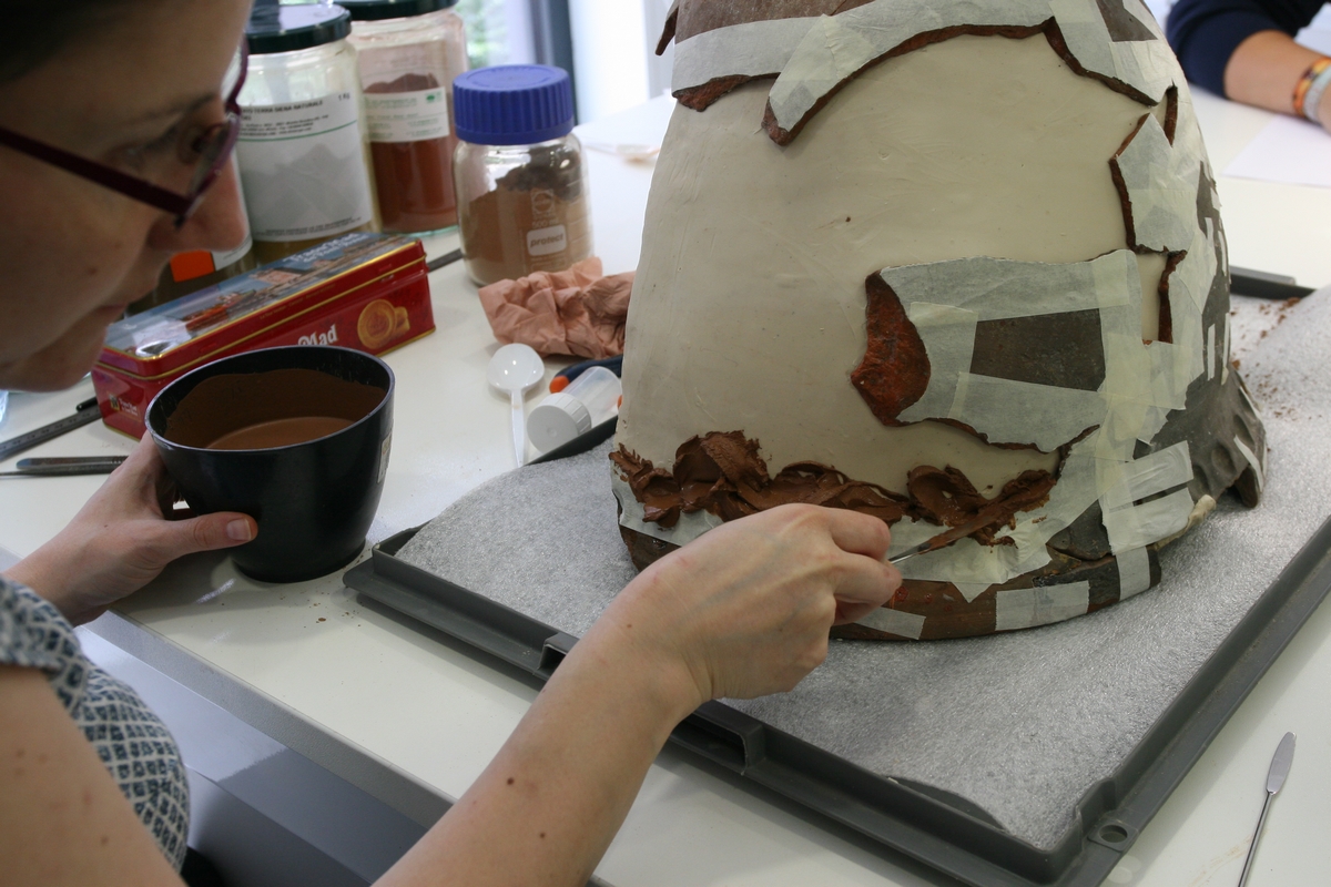 Après avoir protégé la surface de la céramique avec du ruban adhésif, Sandrine Janin-Reynaud applique généreusement à la spatule un plâtre dentaire afin de restituer les lacunes de l’objet. Elle retravaille ensuite la surface du plâtre au scalpel, légèrement en retrait par rapport à l’objet. Après 24h de séchage, le moule en plastiline® peut être retiré.