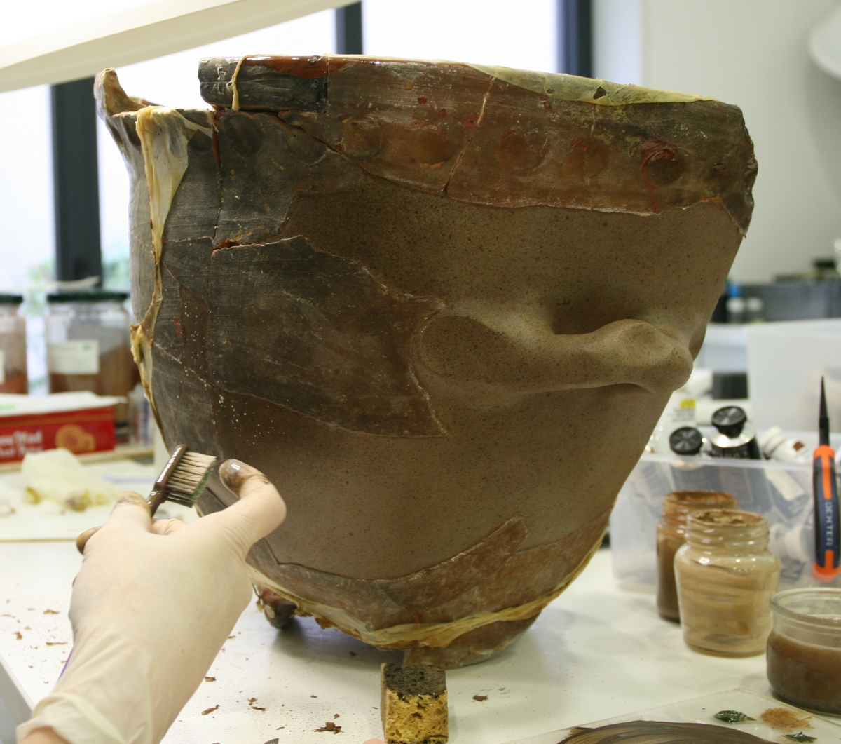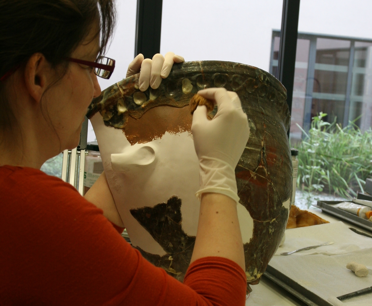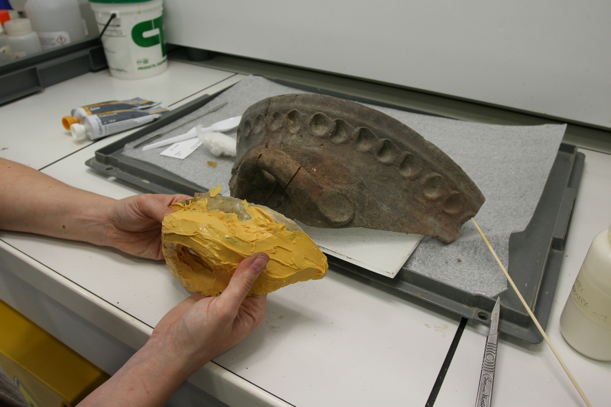 Elle réalise un moule en plastiline®, une "pâte à modeler" spéciale conservation. Une fois étalée au rouleau, la plastiline® est mise en forme directement sur l’objet aux endroits où les comblements seront effectués. Elle s’accroche aux parois intérieures du vase, mais il est nécessaire de la caler avec des mousses à l’arrière pour qu’elle conserve la forme souhaitée pendant l’application du plâtre.