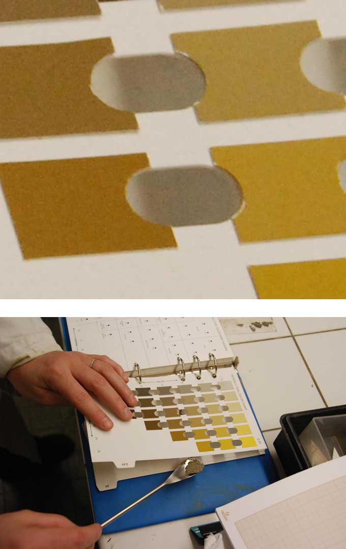 Photo mystère : détail du nuancier de Munsell, dont les ouvertures permettent de placer la terre à proximité des différentes teintes. Lors de la fouille ou en laboratoire, il permet d’utiliser des codes de références communs pour décrire les couleurs des sédiments : limon, sable, argile, etc.