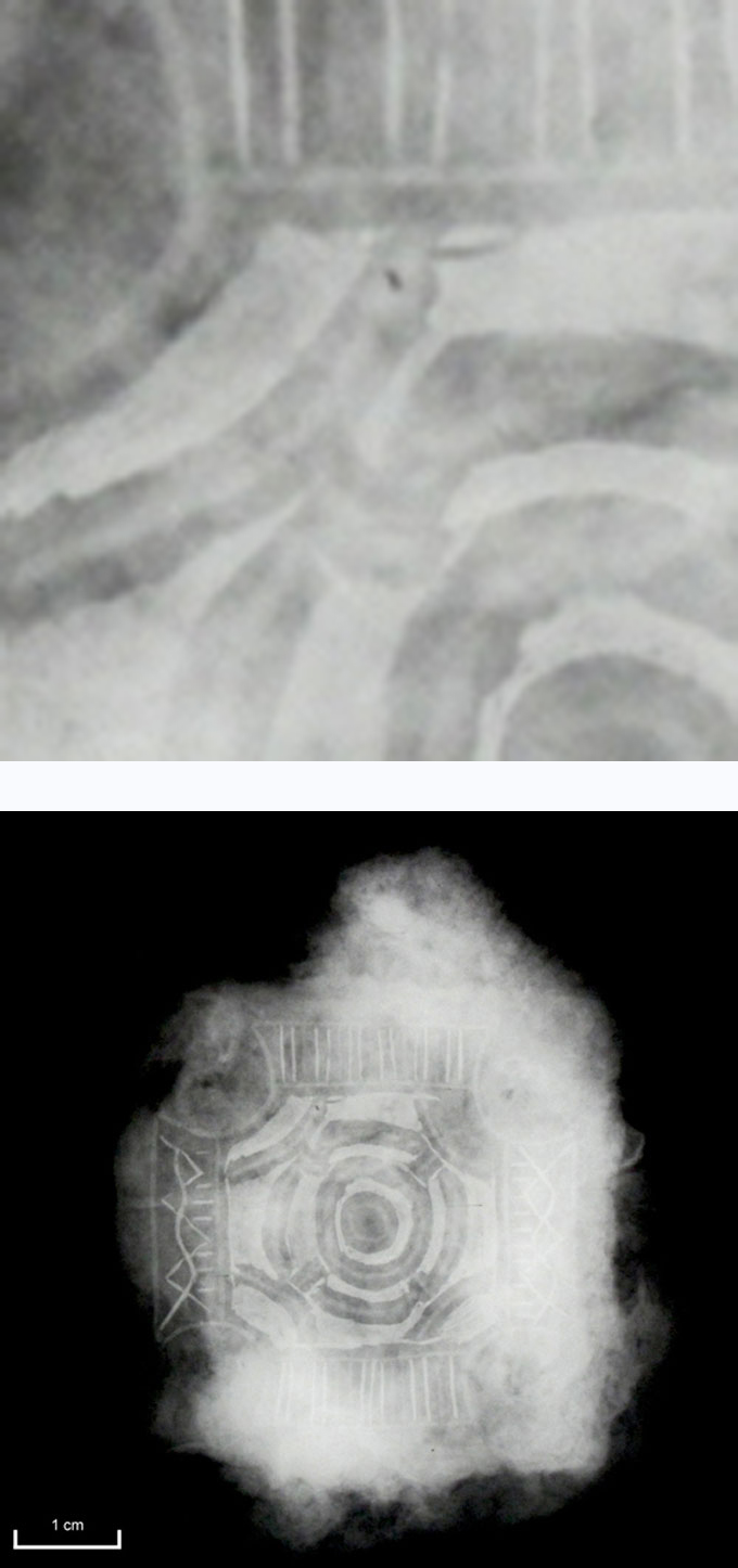Photo mystère : la radiographie de cet élément a mis en évidence une plaque au décor géométrique initialement rivetée sur un ceinturon. La radiographie est utilisée pour identifier les objets corrodés et indiquer aux restaurateurs l'état de conservation de l'objet.