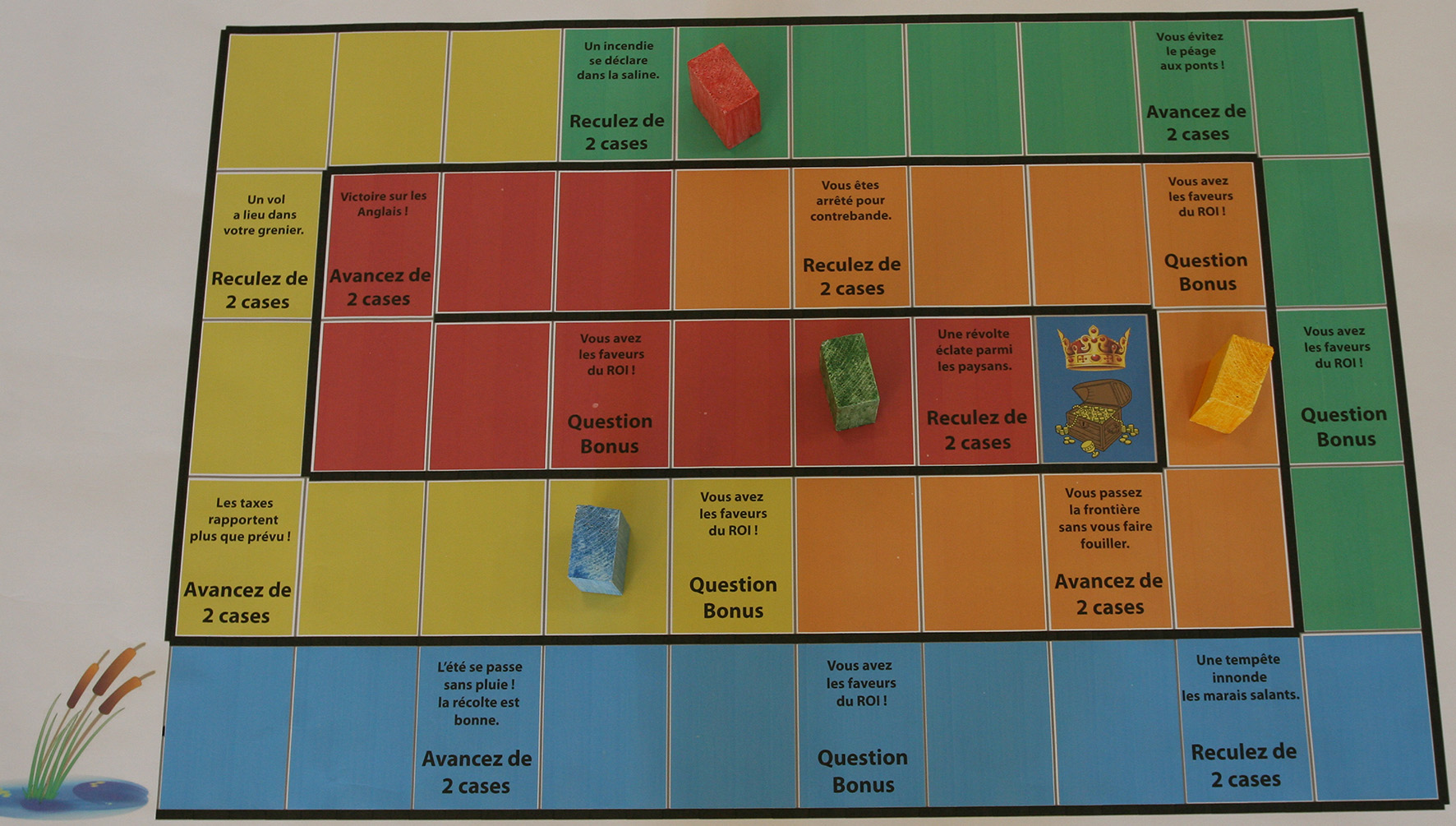 Ce plateau de jeu emmène les joueurs, représentés par des pions de couleur, des marais salants aux coffres du roi. En répondant à des questions, les participants découvrent le fonctionnement des marais salants, les autres modes de production du sel, la gabelle, la contrebande et le pouvoir du roi sur les échanges de sel. Le premier qui arrive au coffre du roi a gagné la partie, mais le chemin est parfois semé d’embûches…