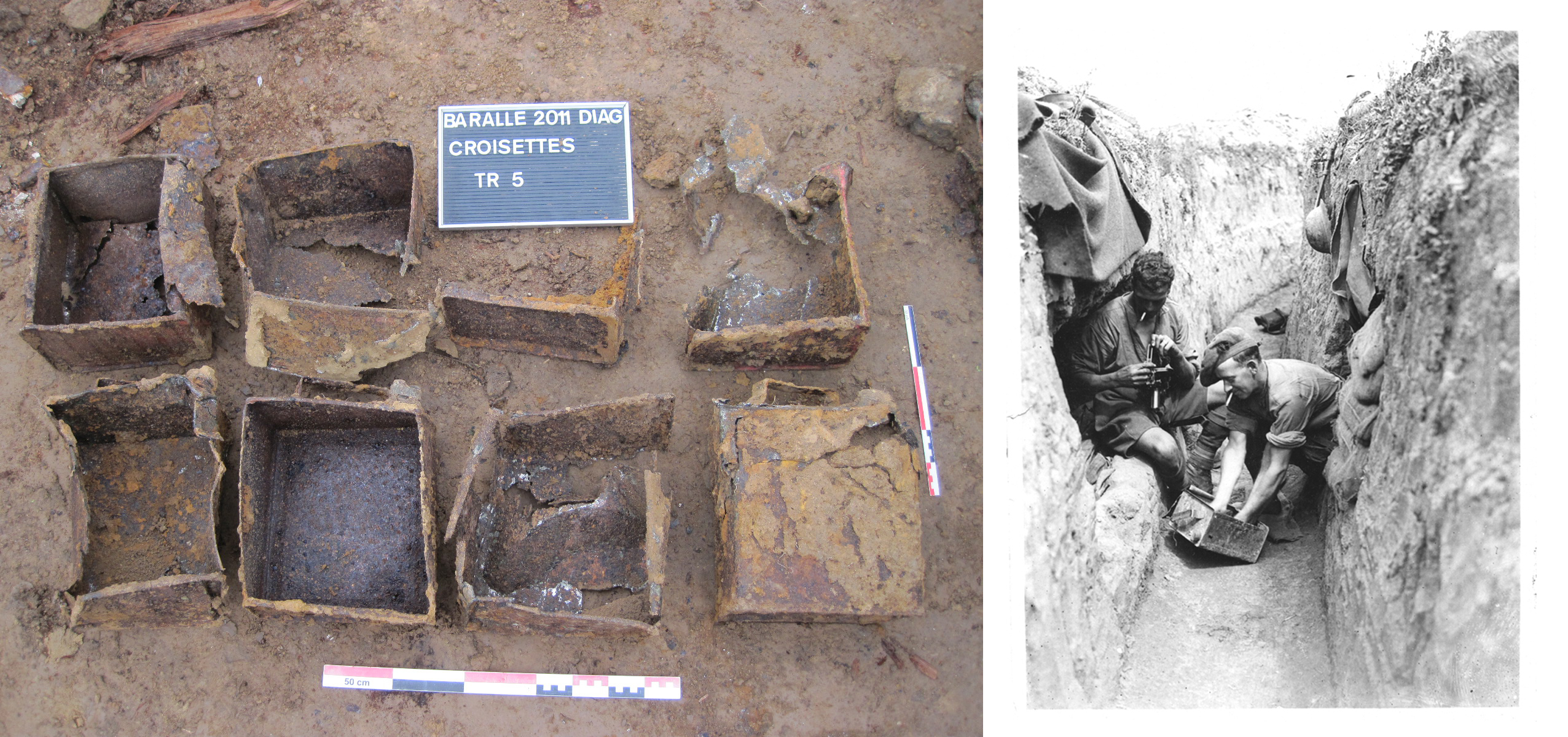 Dans les tranchées de Baralle, pour pallier au manque d’hygiène, des bidons d’essence sont réutilisés comme récipients pour la toilette quotidienne. Photographie de fouille, Direction de l'Archéologie ; photographie d'archives, fonds documentaire A. Jacques