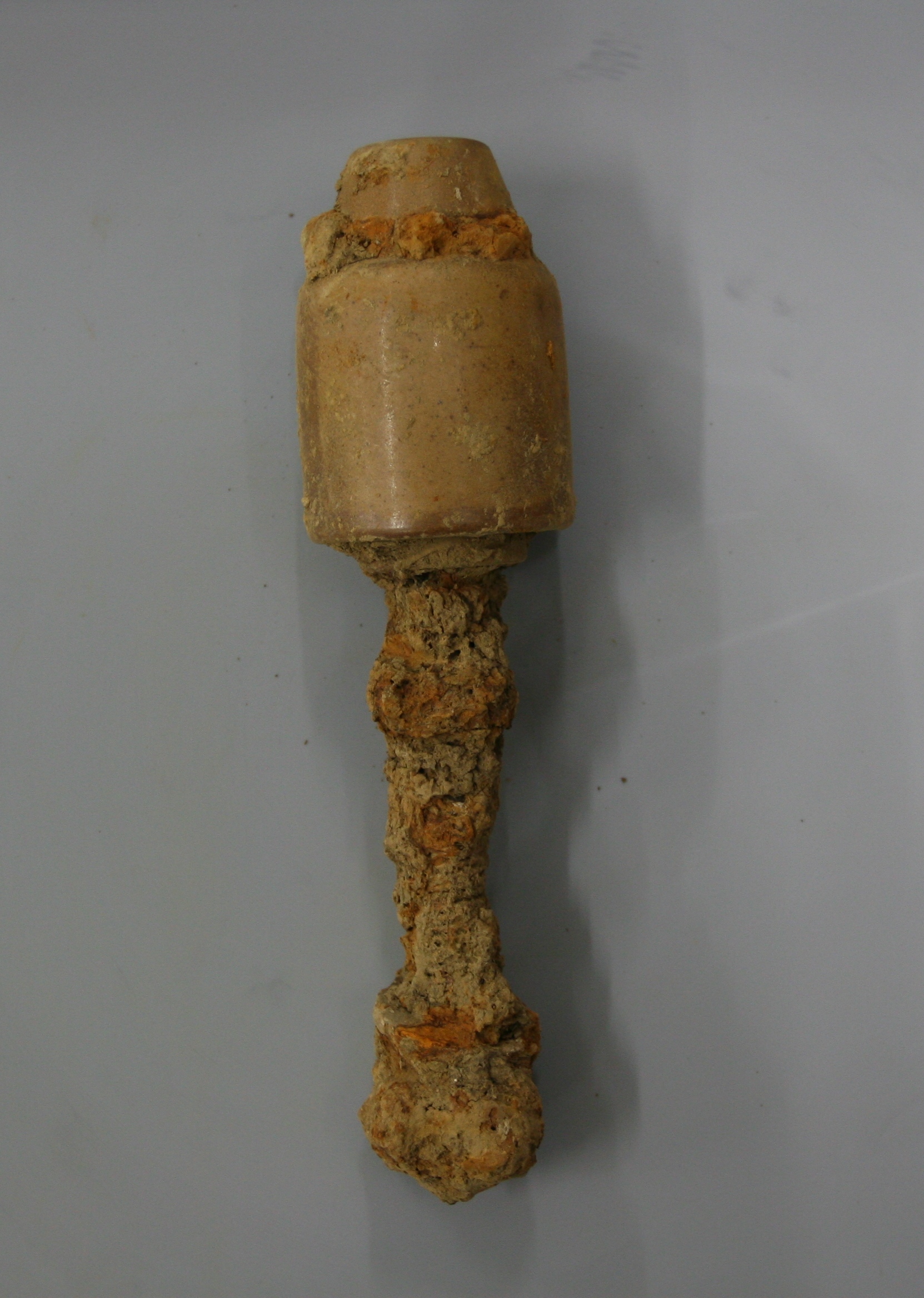 Le téléphone était présent jusque dans les tranchées de première ligne. Le fil téléphonique était tiré sur de longues distances, supporté par des isolateurs en faïence sur support en métal comme celui-ci. D’autres, encore en place, sont visibles à la carrière Wellington à Arras.