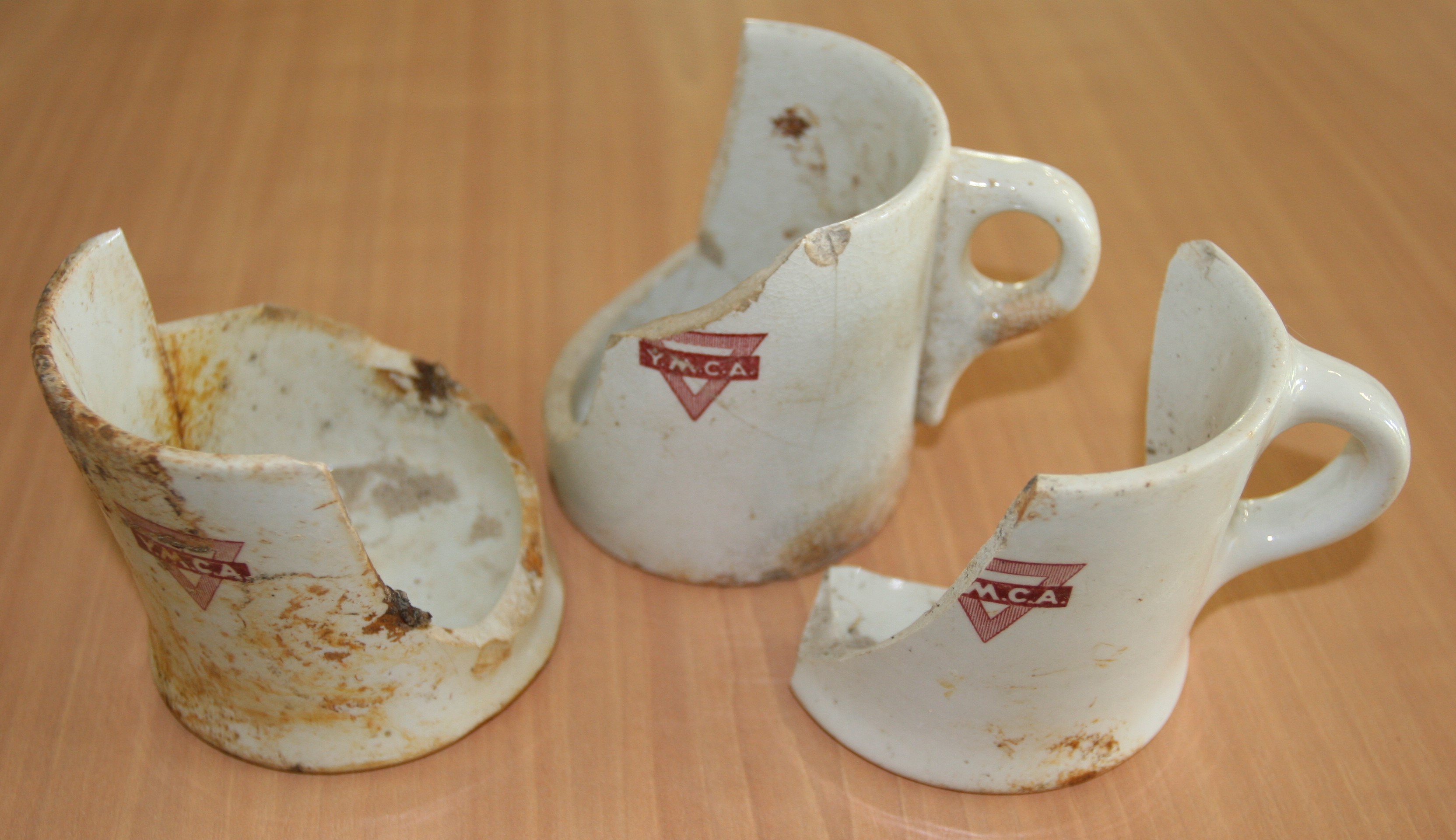 Ces tasses siglées "YMCA" renvoient à l’établissement du même nom, installé à Camiers ou dans les environs. Espace de divertissement et de ressourcement spirituel, le foyer des "Young Men Christian Association" mettait des livres et des jeux à disposition des soldats.