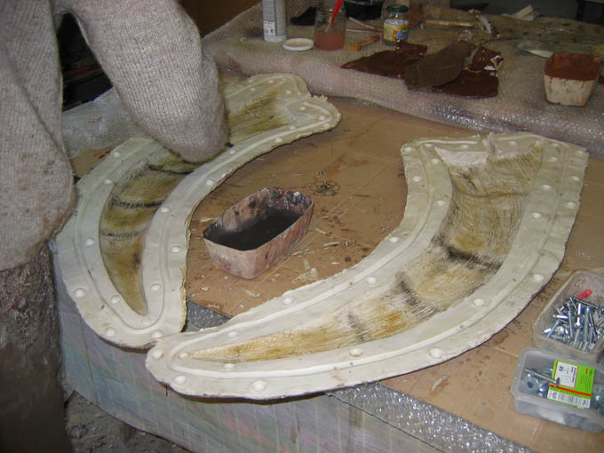 La corne est moulée face par face. Le moulage du crâne nécessite trois parties, la face inférieure du crâne est moulée en premier. Les originaux sont placés dans un lit de pâte à modeler. Celle-ci doit être au contact de l’original suivant une surface horizontale et lisse.