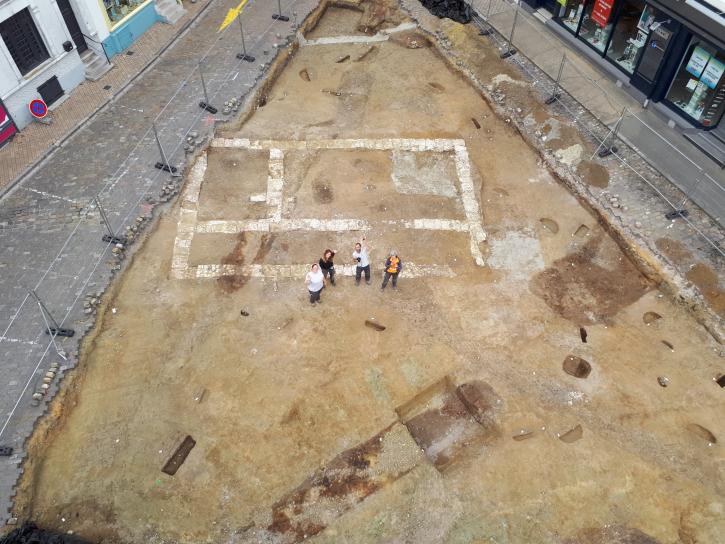 La première occupation de ce site situé quasiment au sommet d’une butte tertiaire, en bordure interne de la plaine maritime flamande, est datée, grâce au mobilier céramique, des 10ième-11ième siècles. Elle est d’ordre domestique et s’organise autour d’un parcellaire défini par un réseau fossoyé qui semble abriter un grand bâtiment sur poteau et des structures annexes de type greniers et fosses détritiques. Ce schéma d’occupation, récurrent dans la région côtière à cette période, précède la fondation d’un véritable bourg déterminée par l’installation du seigneur Arnoul Premier dans le dernier tiers du 11ième siècle. D’un point de vue archéologique, cet acte de fondation se traduit par un remaniement complet de l’espace qui se trouve alors divisé entre l’enclos canonial de la collégiale Saint-Nicolas, matérialisé par un large fossé interrompu, et la zone du marché nouvellement établi. Cette activité commerciale n’a laissé comme traces matérielles que des rejets de faune et en particulier de poisson dans le fossé d’enclos. Vers le début du 13ième siècle, le secteur est à nouveau fortement remanié. La partition entre espace religieux et civil est abandonnée au seul profit des laïcs. Le comblement du fossé d’enclos canonial, la mise en place d’un niveau général de place et la construction de bâtiments sur cave caractérisent cette récupération complète de l’espace maintenant essentiellement dévolu aux activités commerciales.