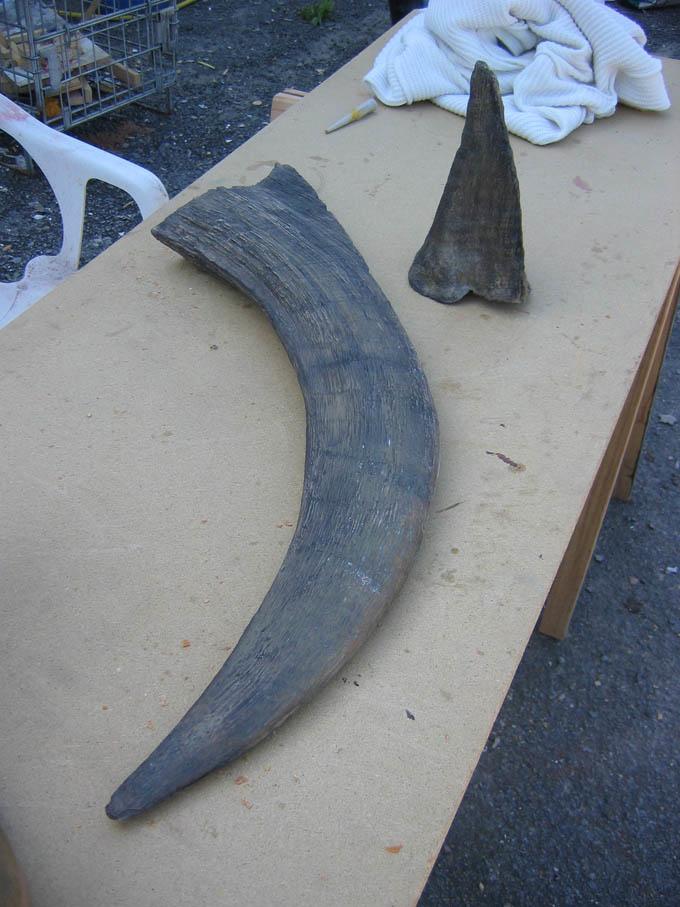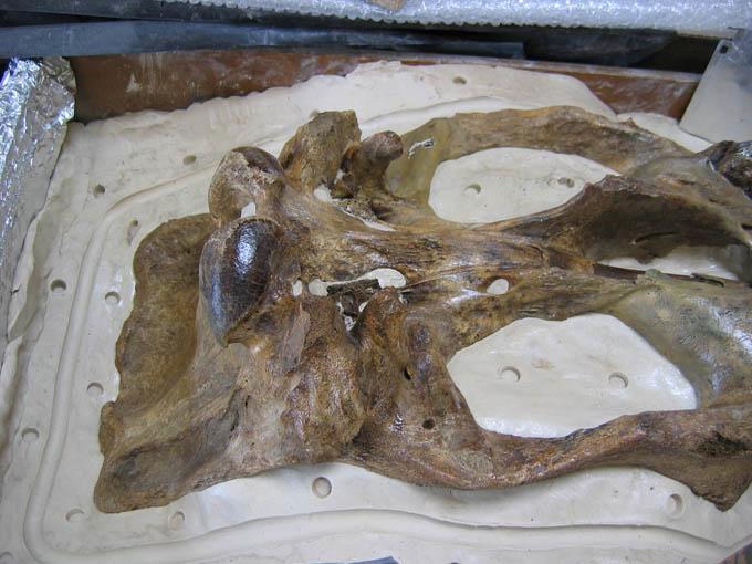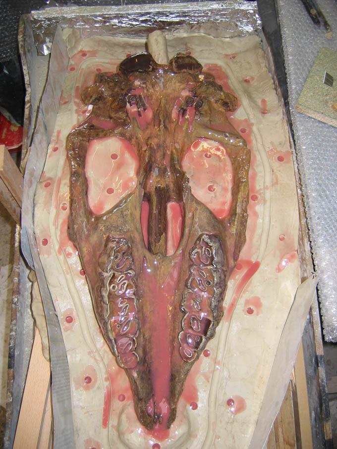 La corne est moulée face par face. Le moulage du crâne nécessite trois parties, la face inférieure du crâne est moulée en premier. Les originaux sont placés dans un lit de pâte à modeler. Celle-ci doit être au contact de l’original suivant une surface horizontale et lisse.