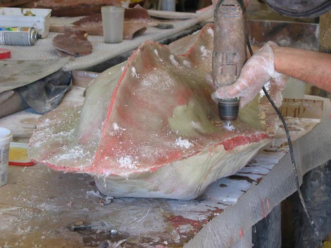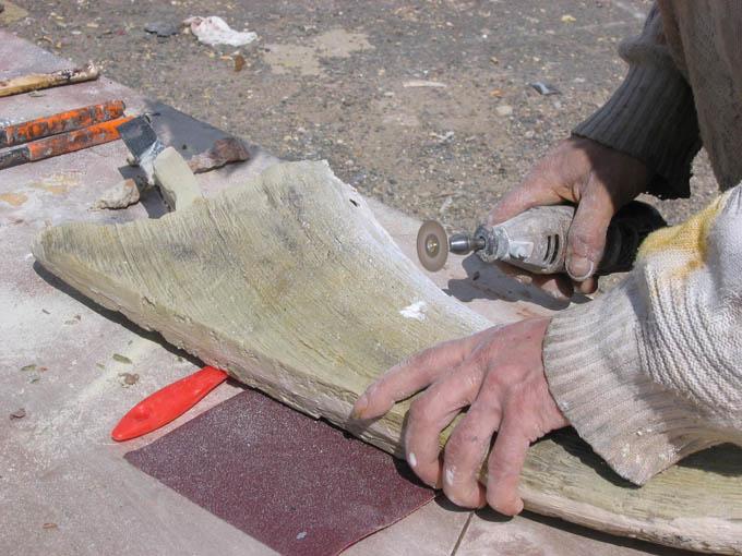 Une fois démoulée, la reproduction est poncée pour enlever la fine excroissance de résine située à la jonction des différentes parties du moule.