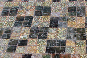 Les carreaux du pavement de la galerie n’ont pas les mêmes caractéristiques que ceux de la salle d’apparat. Ce pavement est organisé pour former plusieurs tapis côte à côte. Les décors géométriques se différencient des uns des autres. L’un de ces tapis est composé de 621 carreaux et il a pour dimensions 2,40 m par 1,50 m. Les carreaux de la galerie mesurent environ 12 cm, c’est un centimètre de moins que ceux de la salle d’apparat. La fonction de cette galerie sert probablement de lieu pour la promenade ou de discussion pour aborder les affaires sérieuses. La qualité du pavement fait valoir le rang social des résidents aux visiteurs.