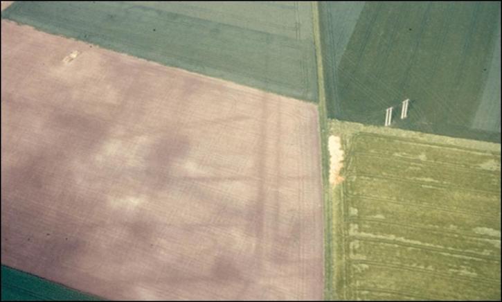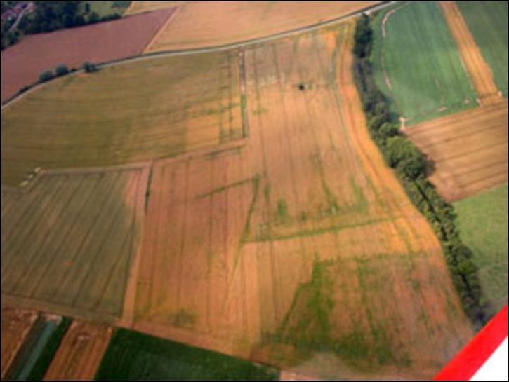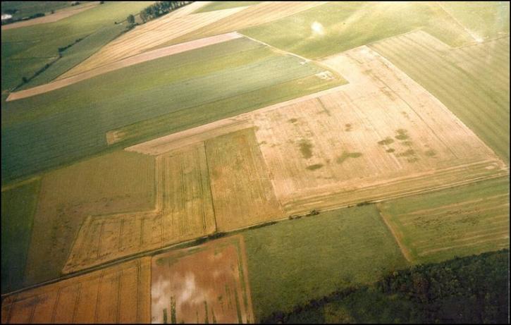 La différence de couleurs dans les cultures révèle la présence de fosses comblées. Les lignes plus sombres sont les limites d’anciennes parcelles. La datation de ces parcelles par la seule vue aérienne n’est pas possible. Il y a probablement une superposition de parcelles de différentes époques, de l’Âge des métaux au Moyen Âge.