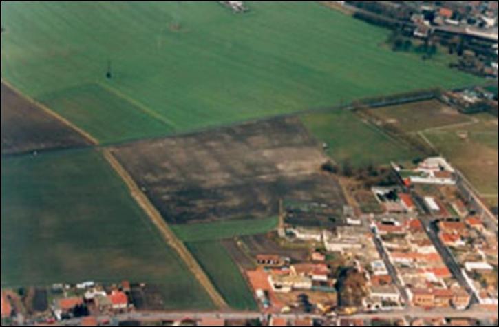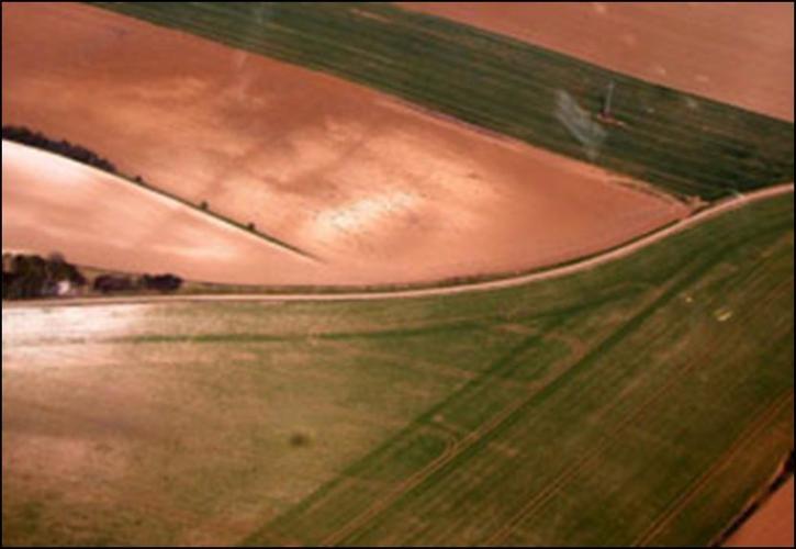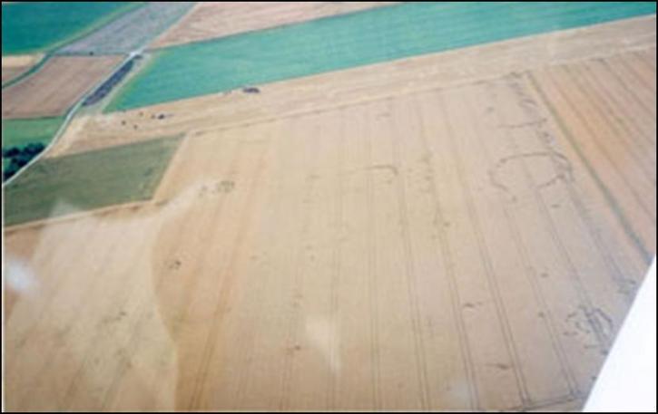 Deux lignes parallèles où les céréales sont encore vertes marquent l’emplacement d’une ancienne voie. A gauche on distingue de nombreuses petites dépressions comblées. L’interprétation de ces vestiges est difficile.