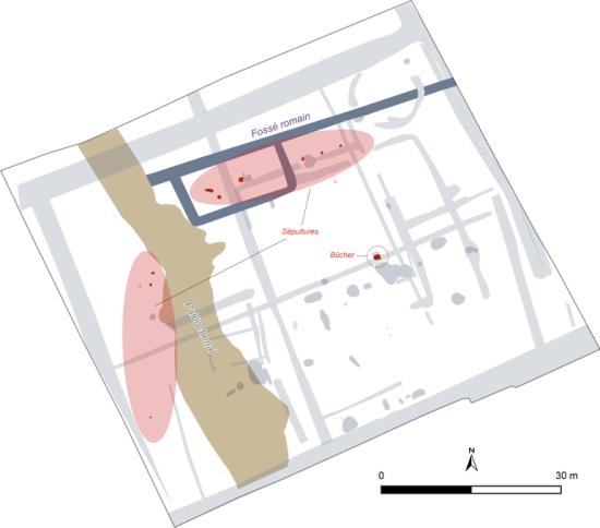 L’installation du cimetière gallo-romain semble s’organiser le long d’un de ces chenaux. Mais le chenal pourrait également être postérieur et avoir en partie détruit la zone.
