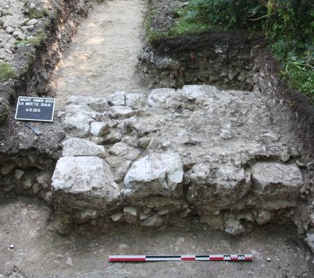 En périphérie sud de la motte, une dalle de fondation d’une largeur supérieure à 2,40 m en cassons de calcaires, forme les derniers vestiges de la courtine de l’ancien château.