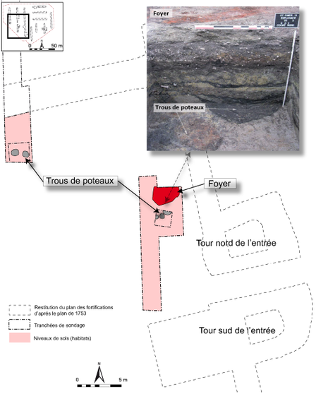 Dès l’ouverture des premières tranchées dans le secteur sud-ouest de l’Esplanade, les vestiges de la fortification ont été rapidement identifiés sous la chaussée. En s’aidant des sources iconographiques géoréférencées, il a été possible d’identifier la courtine nord, la tour d'angle nord-est et les deux tours de la porte.