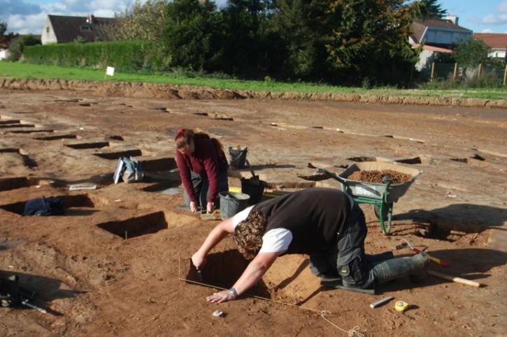 Les fondations des deux grands bâtiments ont été entièrement fouillées. Les poteaux faîtiers et intermédiaires ainsi que la tranchée de fondation des murs sont très visibles.