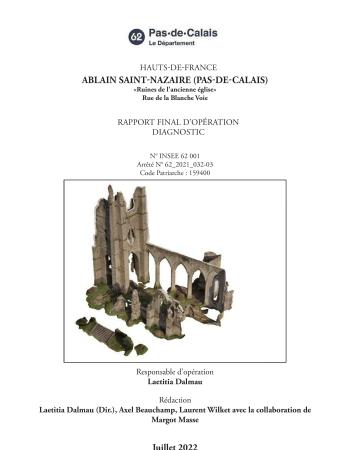 Le projet de mise en conformité de l’accessibilité PMR des ruines de l’ancienne église sur la commune d’Ablain-Saint-Nazaire a conduit à la prescription d’un diagnostic archéologique par le Service régional de l’archéologie des Hauts-de-France. L’opération a été menée par la Direction de l’archéologie du Pas-de-Calais du 04 au 08 avril 2022. Dix tranchées linéaires et cinq sondages ont été réalisés, représentant une surface totale d’ouverture, hors contraintes, de 106 mètres carrés pour une superficie de 994 mètres carrés, soit 10,6 % de la zone diagnostiquée et 6 % de la surface totale.