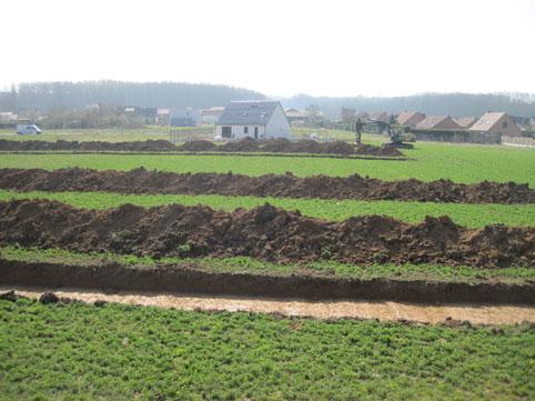 L’intervention s’est déroulée le 09 avril 2015 sur une emprise de 12 689 mètres carrés. Les contraintes techniques, liées à l’inaccessibilité au terrain, dues en majeure partie à la présence de nombreux talus, ont conditionné l’opération sur une emprise réduite. L’investigation a donc porté sur une surface accessible de 10 852 mètres carrés. Au total cinq tranchées ont été réalisées. Le site ne présente aucun vestige archéologique en place.