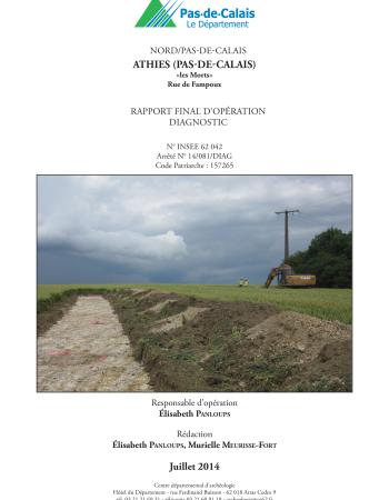 Sur prescription du Service régional de l’archéologie, le Centre départemental d’archéologie du Pas-de-Calais a procédé à un diagnostic sur l’emprise d’un projet de création d’un lotissement à Athies. Le futur aménagement est situé au nord-est de la commune, légèrement en retrait de la route menant à Fampoux, sur le versant nord de la Scarpe. Le projet s’étend sur 13 182 mètres carrés. Huit tranchées ont été réalisées, représentant 12 % de la surface prescrite.