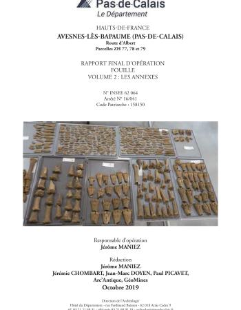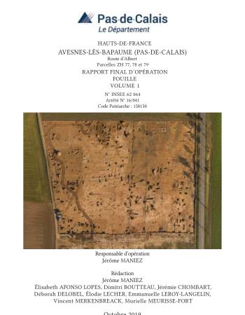 J. MANIEZ dir., É. AFONSO LOPES, D. BOUTTEAU, J. CHOMBART, D. DELOBEL, É. LECHER, E. LEROY-LANGELIN, V. MERKENBREACK, M. MEURISSE-FORT, Avesnes-lès-Bapaume (Pas-De-Calais), Route d’Albert, Parcelles ZH 77, 78 et 79, Rapport final d’opération de fouilles, éd. Direction de l’Archéologie du Pas‑de‑Calais, Dainville, 2019, 484 p., 397 fig.