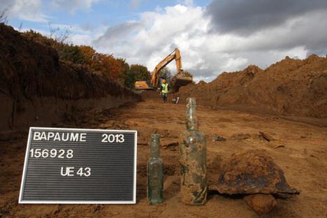 L’opération s’est déroulée du 21 au 24 octobre 2013. Au total, 7 tranchées ont été réalisées, soit une superficie de 5963 mètres carrés, correspondant à 12,8 % de la surface prescrite. Près de 3 hectares se sont avérés perturbés par les travaux liés à la construction de la ligne TGV sur une profondeur dépassant par endroits 2,40 mètres. En effet, sur ce tronçon la ligne ferrovière est enterré de telle sorte que les caténaires se situent à la hauteur du niveau de sol actuel. Les travaux ont ainsi engendrés un décaissement conséquent du substrat loessique, lequel fut ensuite déversé sur l’emprise de diagnostic à l’emplacement de la vallée sèche et de l’ancienne fabrique à sucre démolie lors de la Première Guerre Mondiale pour être ensuite nivelé. Les seuls vestiges mis au jour lors de l’opération sont à rattacher à la Première Guerre Mondiale, et plus précisément à l’occupation de la zone par les troupes britanniques entre mars 1917 et mars 1918.Un réseau dense de tranchées et boyaux occupe l’angle nord-ouest de l’emprise sur près de 4000 mètres carrés. Quelques structures de la même période ont été repérées au sud-est.