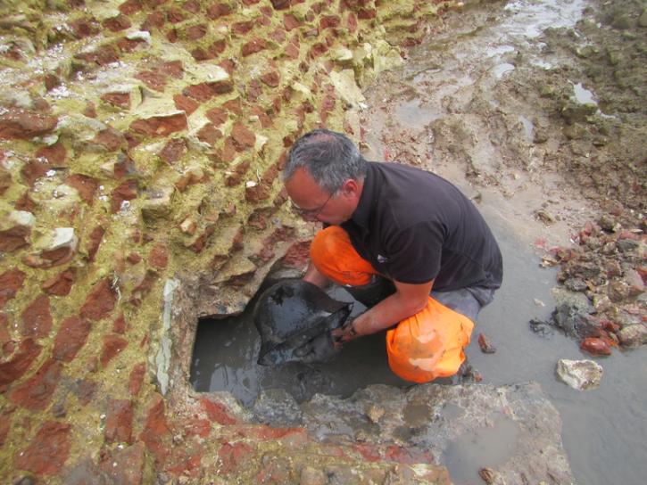 Plusieurs objets (compas, clé, vaisselles, boulets, etc.) ont été retrouvés au pied des murs des fortifications ou dans la canalisation du batardeau. Sur la photo, un casque anglais qu’un archéologue sort de l’eau après plus de 450 ans.