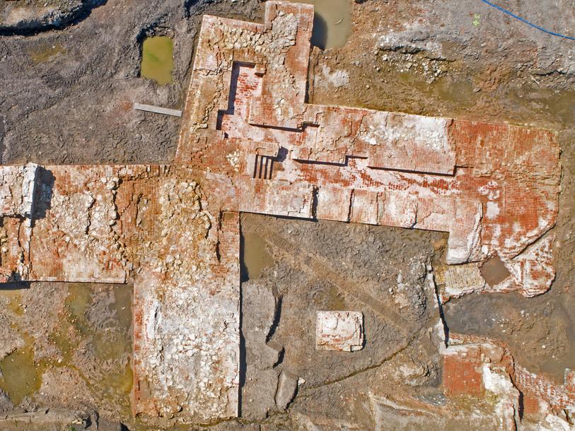 Image de gauche : Les archéologues ont mis au jour les vestiges d’un bastion d’angle de 500 mètres carrés, des portions des murs fortifiés (des courtines) et un batardeau (un barrage). La position avancée du bastion par rapport au mur fortifié est plus adaptée à une défense contre l’artillerie adverse. Ce type d’ouvrage a vraisemblablement inspiré un siècle plus tard les fortifications de « Vauban ».