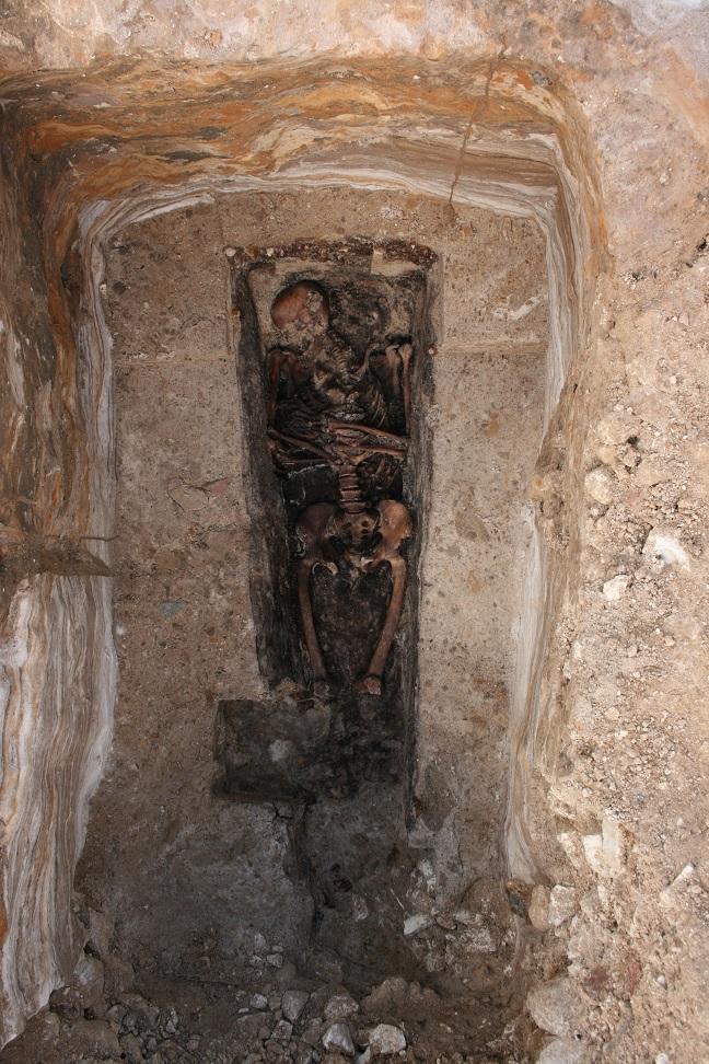 Devant l’autel principal de l’église basse, une tombe a été mise au jour, creusée dans le sable à plus d’un mètre de profondeur. Sa position et le soin apporté à sa réalisation laissent penser qu’elle accueille un personnage important de la communauté de l’abbaye. Il ne doit cependant pas s’agir du saint fondateur, dont les textes indiquent le déplacement des reliques dans le choeur supérieur au cours du Moyen Âge. La découverte des restes d’un cercueil est exceptionnelle, car le bois est une matière périssable. Ce cercueil était scellé par une quarantaine de clous. Des prélèvements ont été réalisés dans la tombe sur les restes de cercueil et deux objets trouvés autour de celui-ci : leur analyse permettra d’identifier les matériaux utilisés et peut-être de dater la tombe.