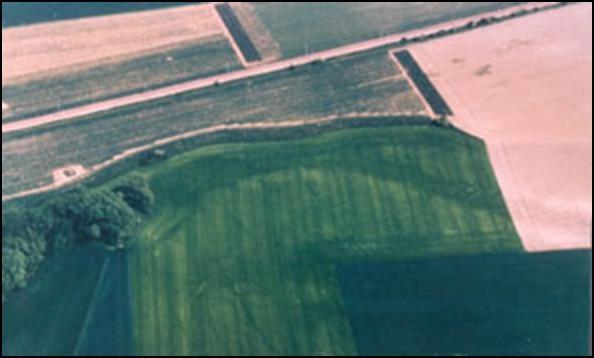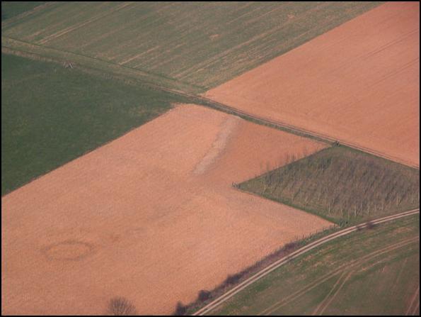 Dans un champ à Orlancourt, l'humidité qui se dégage à la surface des anciens fossés, fait apparaître un enclos circulaire.