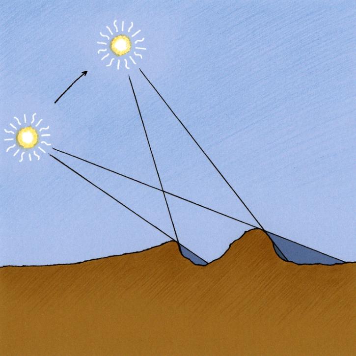 Certains sites créent à la surface du sol, ou dans les cultures, d'infimes creux et bosses. Quand le soleil est bas sur l'horizon, en hiver ainsi que le matin et le soir, l'éclairage accentue les ombres et rend visible ces micro-reliefs.