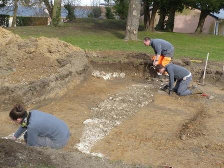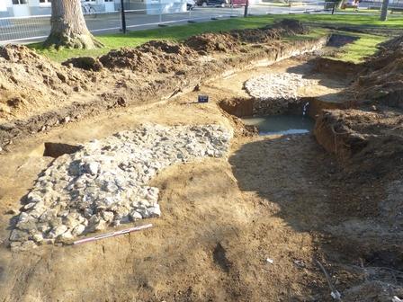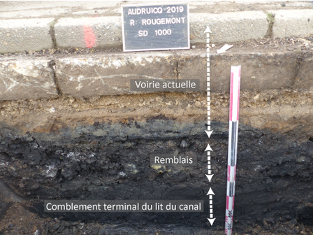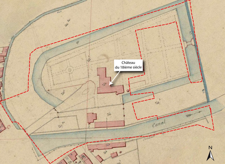 Au sud du parc de la mairie, le cadastre napoléonien de 1833 fait figurer une portion du canal construit à la fin du 17ième siècle pour recueillir les eaux des deux rivières de la ville. Six sondages ont été réalisés dans la rue Alfred Rougemont et sur la place des marronniers où se situe l’ancien tracé du canal. Ils ont permis d’observer le comblement terminal du lit du canal sous les différentes couches de remblai qui portent la voirie actuelle.