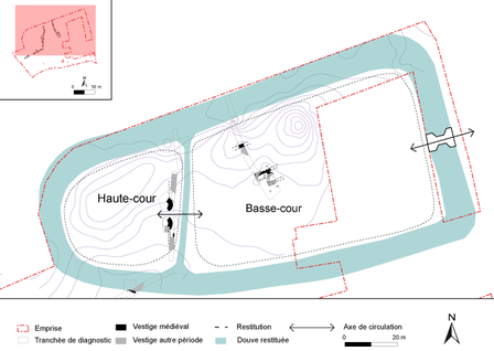 La partie sud-est du tertre est occupée par les deux tourelles ménageant entre elles un espace de 2 mètres de large. Probablement destinées à défendre un accès entre la haute et la basse-cour, elles faisaient sans doute partie d’un dispositif de défense plus étendu mais difficile à appréhender. En effet, dès le 13ième siècle et le début du 14ième siècle, des châteaux circulaires ou polygonaux construits avec des pierres ou des briques vont remplacer les châteaux à motte féodale en bois. Dans ce cas précis, seule la tourelle sud aurait pu être prolongée par un mur de courtine [glossaire] restituable à l’emplacement de la fosse se situant au sud de la tourelle. La tourelle nord, quant à elle, s’interrompt subitement au nord contre des niveaux de plateforme qui apparaissent assez hauts dans ce secteur. Il pourrait s’agir d’un dispositif mixte associant de la terre et de la pierre, la pierre étant réservée pour l’entrée, secteur stratégique du château.