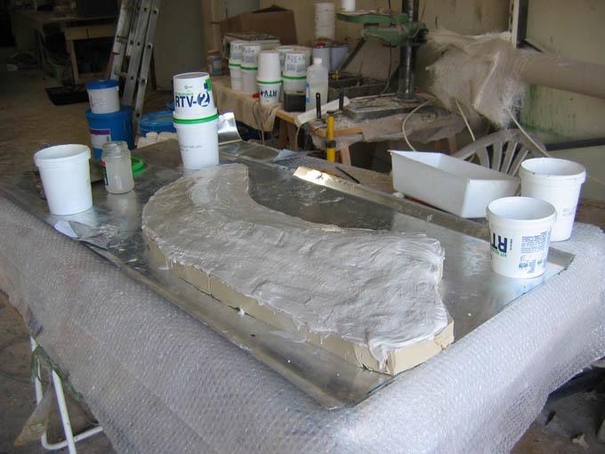 La première couche de silicone liquide est appliquée au pinceau pour prendre tous les détails. Ensuite du silicone visqueux est étendu avec une spatule pour obtenir une membrane d’un centimètre d’épaisseur. Le silicone, de couleur rose ou blanc selon le fournisseur, recouvre l’original ainsi que la pâte à modeler.
