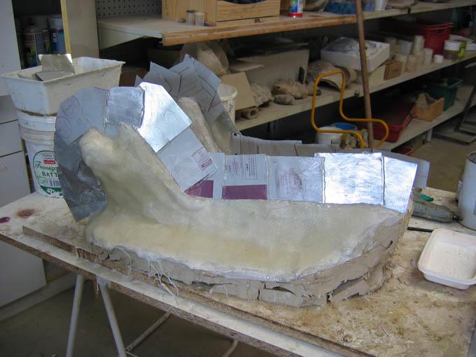 Toutes ces étapes sont répétées autant de fois qu’il y a de parties dans le moule. Il faut compter deux jours pour chaque partie du moule. Le crâne, moulé en trois parties, nécessite une semaine de travail. Avant de démouler l’original, les chapes sont percées pour pouvoir être boulonnées ensemble et constituer une carapace rigide pour les membranes de silicone.