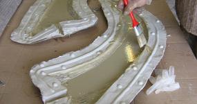 Pour chaque membrane de silicone, une chape en résine est réalisée. Une première couche de résine est appliquée au pinceau. Des bandes de fibres de verre viennent recouvrir la résine encore poisseuse.