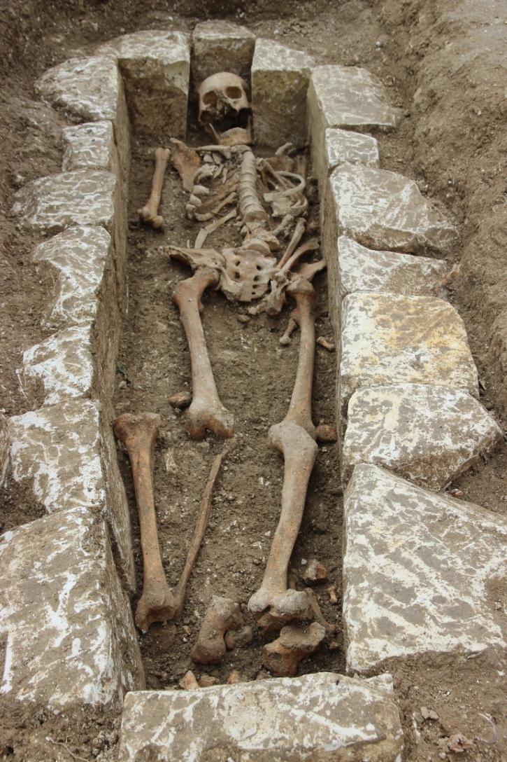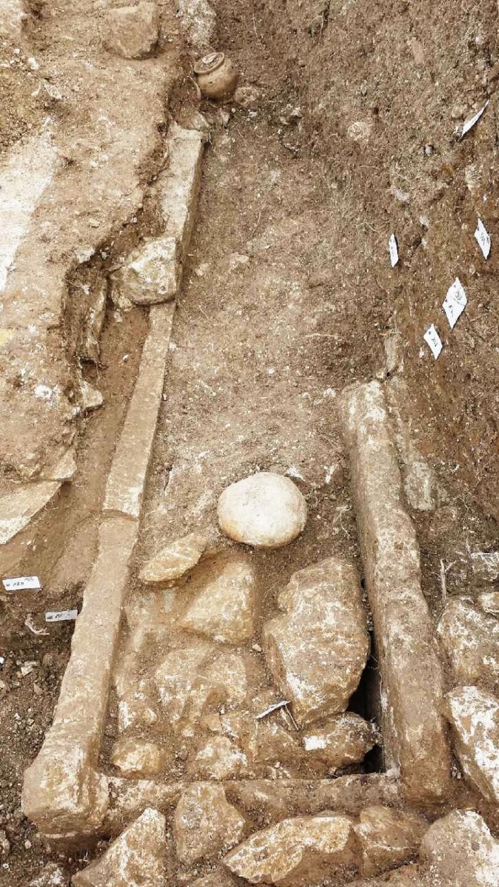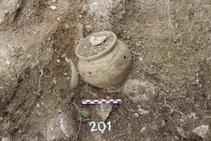 La tombe de cet enfant, creusée en pleine terre, a été en partie détruite par la construction d'un mur. C’est un indice parmi d’autres pour affirmer que le site a été occupé pendant plusieurs siècles et a évolué dans le temps.
