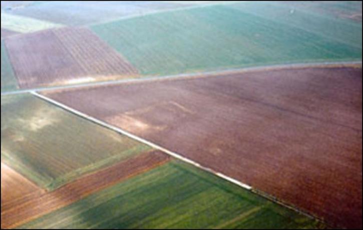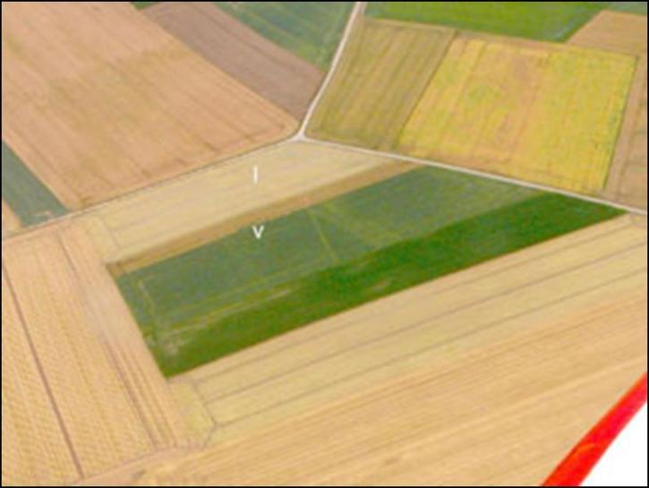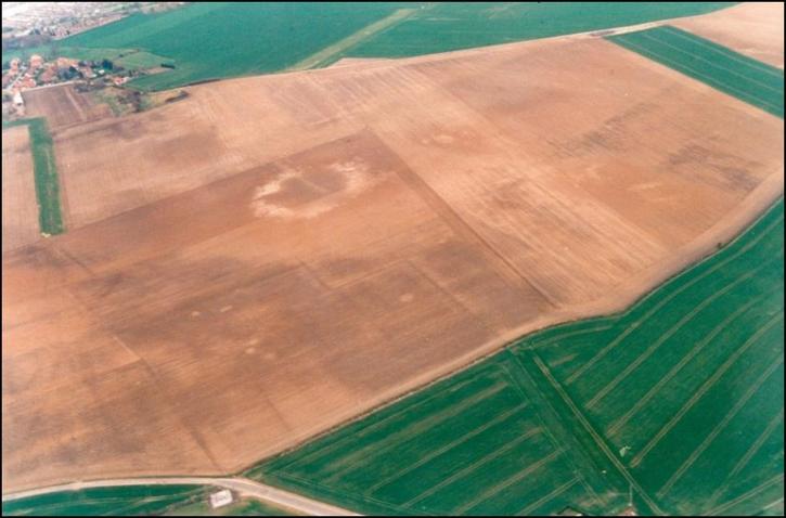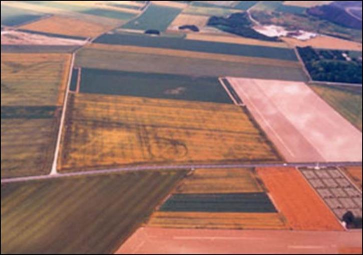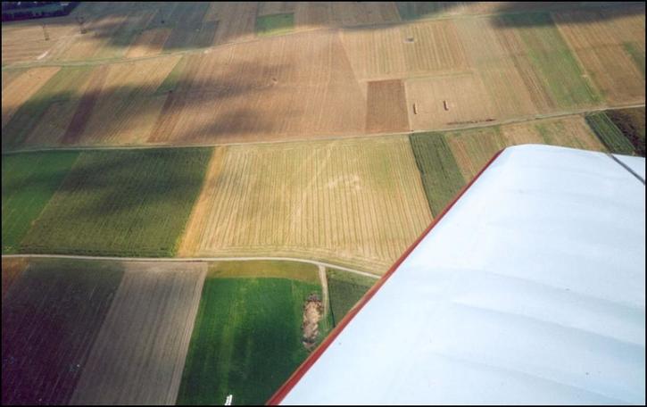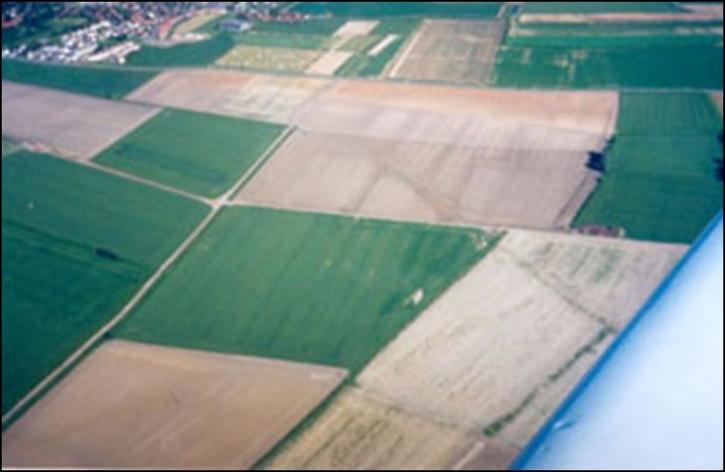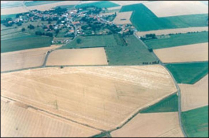 La différence de couleurs dans les cultures révèle la présence de fosses comblées. Les lignes plus sombres sont les limites d’anciennes parcelles. La datation de ces parcelles par la seule vue aérienne n’est pas possible. Il y a probablement une superposition de parcelles de différentes époques, de l’Âge des métaux au Moyen Âge.
