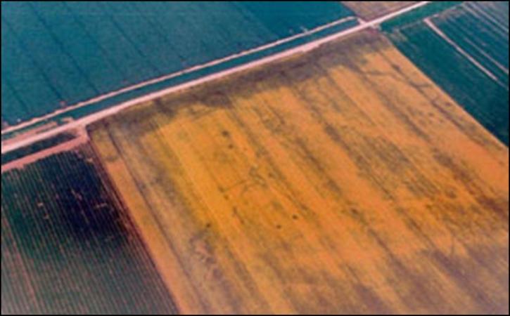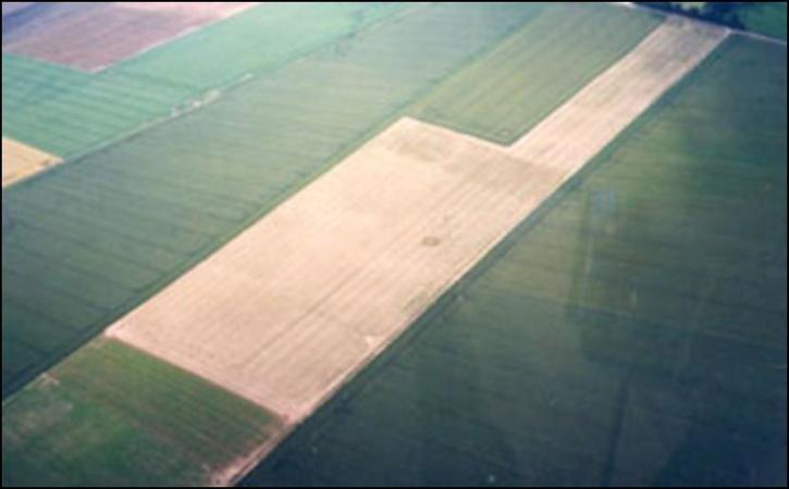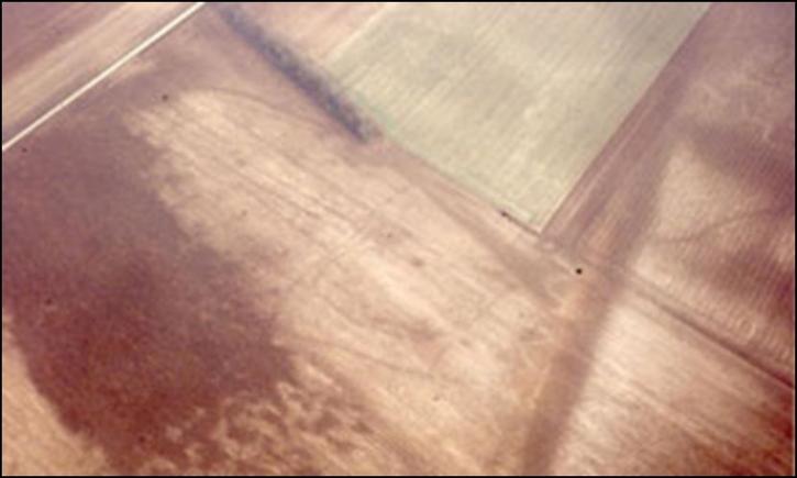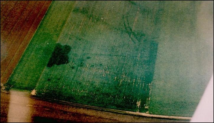 Deux lignes parallèles où les céréales sont encore vertes marquent l’emplacement d’une ancienne voie. A gauche on distingue de nombreuses petites dépressions comblées. L’interprétation de ces vestiges est difficile.