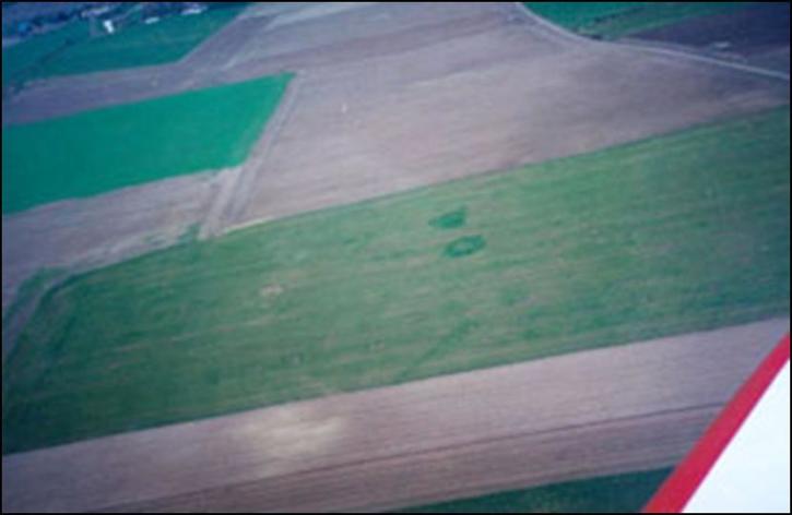 Deux petites structures circulaires ont été comblées, elles favorisent la pousse des céréales qui sont plus hautes et plus vertes à cet endroit. Aucune datation ne peut être proposée.
