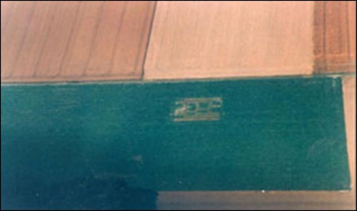 Sur une petite zone quadrangulaire, les céréales sont plus jaunes et moins hautes. Des substructions en pierre de forme quadrangulaire ont ralenti la pousse des céréales. Il s’agit peut-être d’un petit édifice d’habitation.