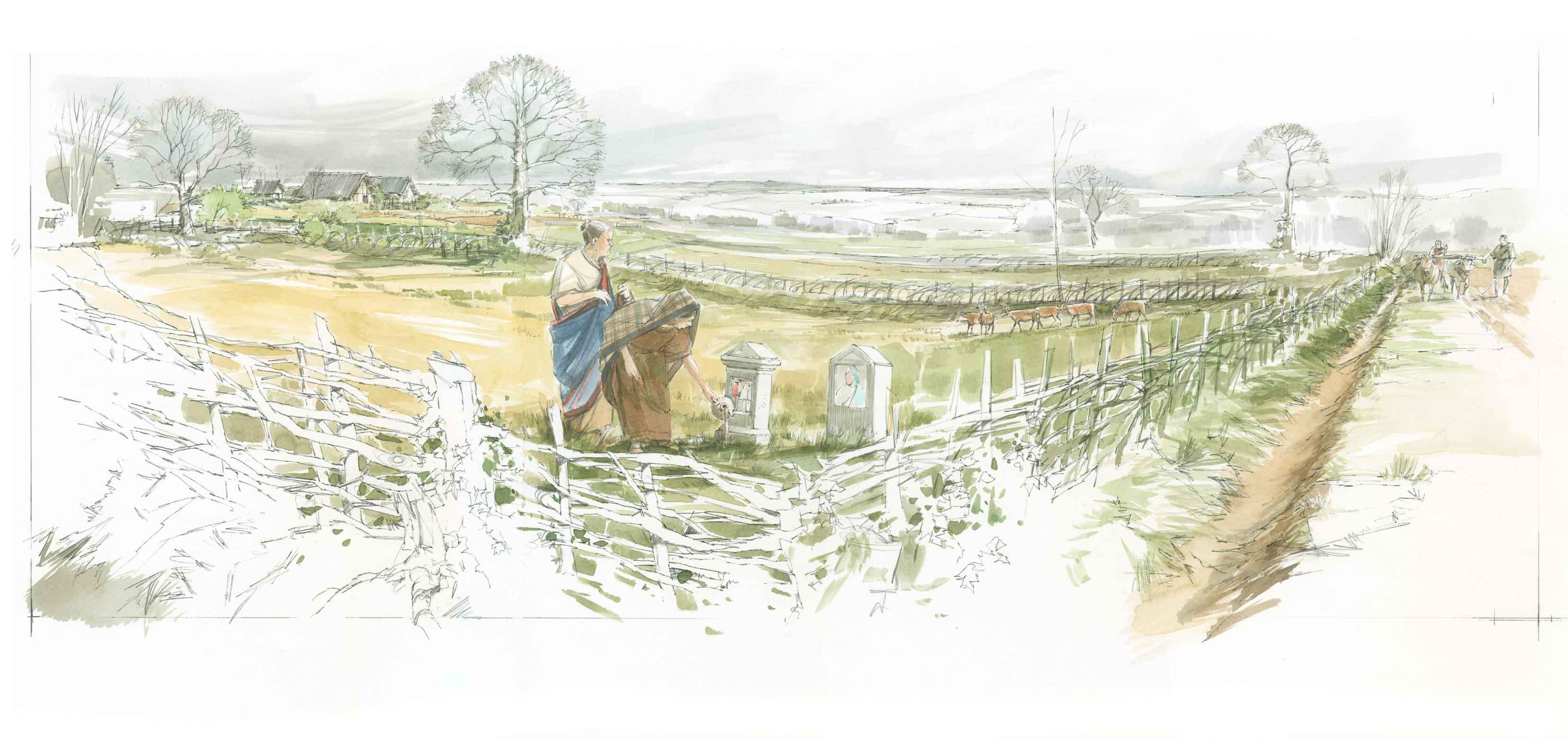 Les fossés, conservés sur 30 centimètres, étaient probablement doublés d’un talus et/ou d’une haie. Des interruptions mises en évidence par les archéologues laissent supposer des ouvertures dans les systèmes d’enclos, afin de faciliter le passage des hommes et des animaux. Le dessin ci-contre évoque un système d’enclos d’époque antique, doublé d’une palissade en bois et bordant des tombes.