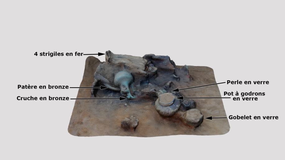 L’une des sépultures découverte lors d’une fouille à Marquise en 2017, a livré un dépôt funéraire antique dans un très bon état de conservation. Ce dépôt est caractérisé par la présence des vestiges d’un coffre en bois renfermant un service à ablution. La numérisation des objets a donné lieu à la modélisation 3D du coffre et du dépôt dans une vidéo pour contextualiser l’ensemble des données recueillies.