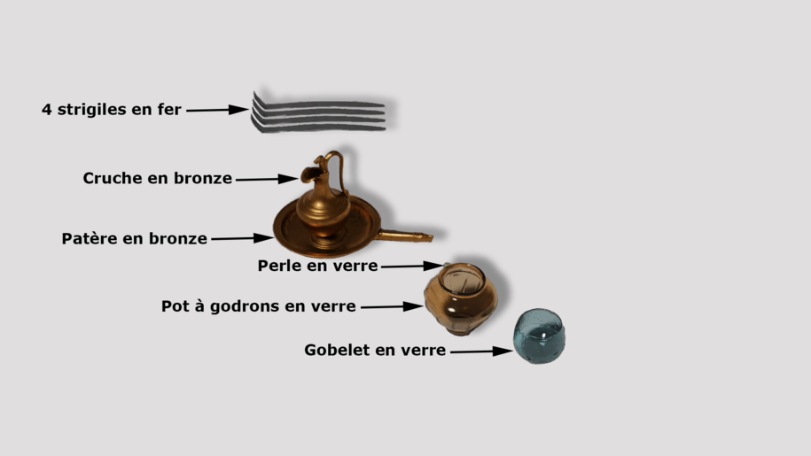 La dotation à l’intérieur du coffre est composée d’un service à ablution en bronze. À l’extérieur, des verreries et un ensemble de strigiles en fer se trouvent à proximité.