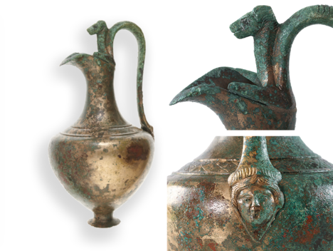 La cruche est en bronze de production gauloise (de type Tassinari E 3000 ou Eggers 127) avec protomé à tête de cheval. La poignée de l’anse est ornée d’un motif végétal. L’attache inférieure représente un visage jeune et joufflu avec des cheveux lisses couvrant les oreilles. Il s’agit peut-être d’un visage de ménade.