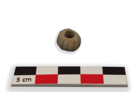 La perle côtelée en melon (Melonenperlen) est à peine visible sur la modélisation, elle pèse 1 gramme et mesure 1centimètre 3 de diamètre. Elle est réalisée en fritte, c’est-à-dire en grains de silice agglomérés à chaud (entre 600 - 800 degrés celsius) dans un moule et colorés par des oxydes métalliques de cuivre (bleu ou vert).