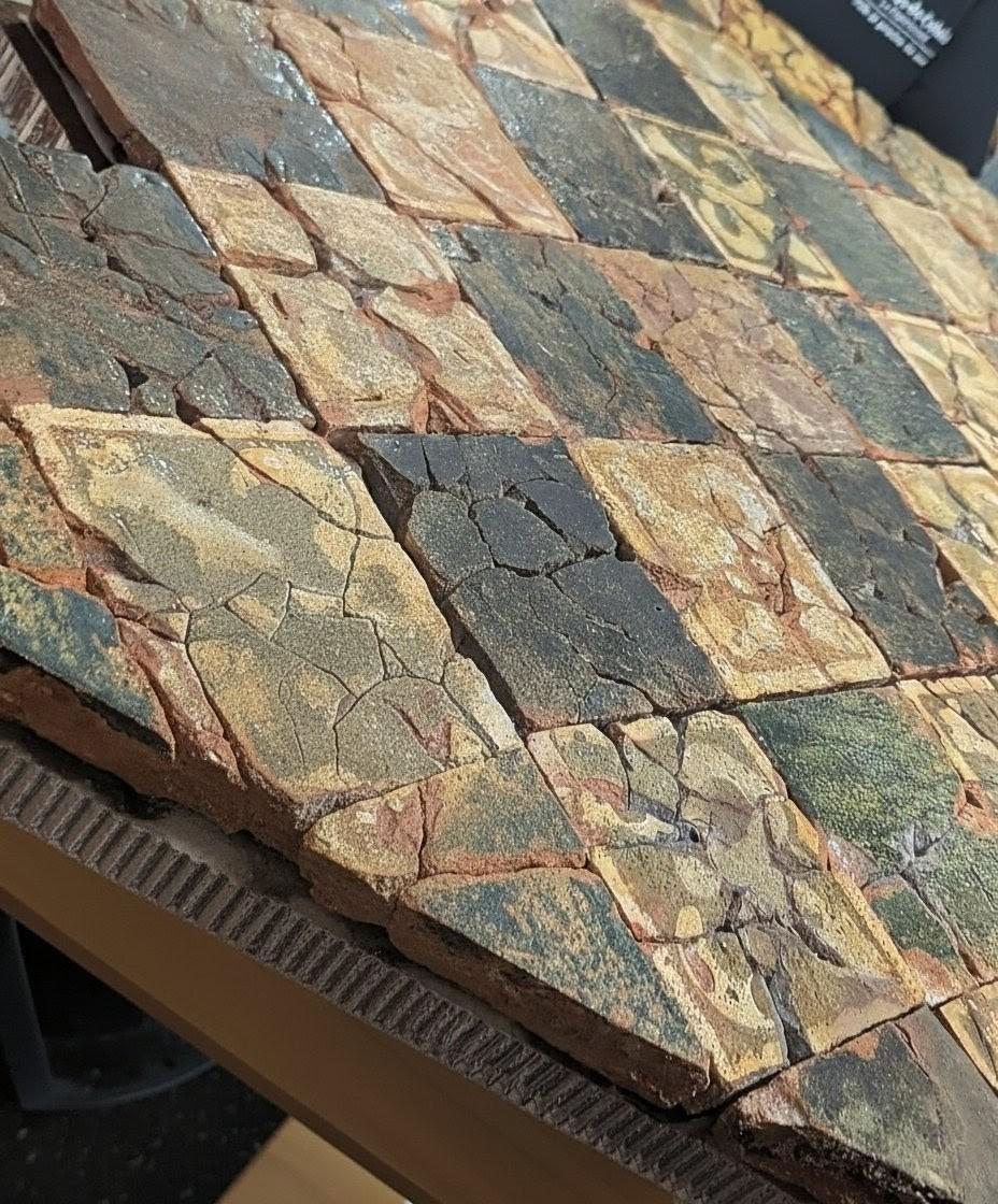 Compte tenu de leur fragilité et de leur valeur patrimoniale, les pavements ont fait l’objet d’un prélèvement méthodique, avant d’être confiés à des restaurateurs spécialisés dans le cadre d’une campagne de restauration minutieuse de longue haleine, menée avec l’expertise du Louvre‑Lens.