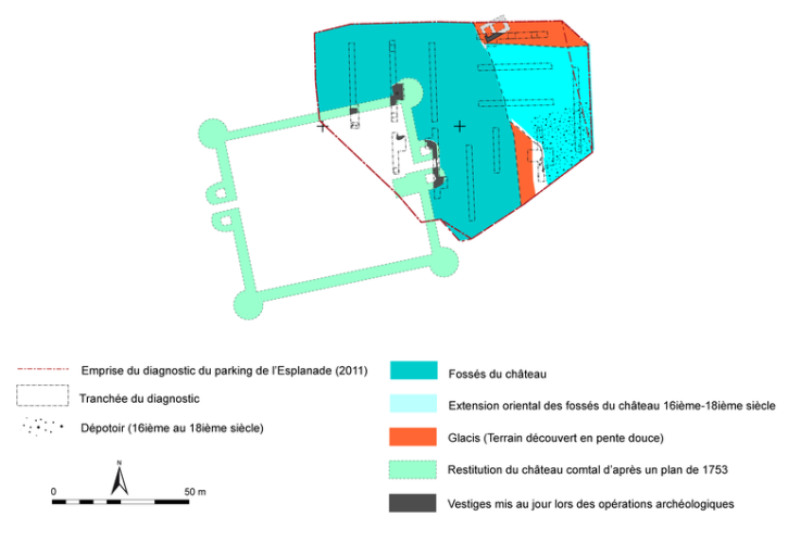 Les courtines nord et est du château constituaient l’escarpe du fossé. Les sondages effectués au pied des maçonneries n’ont pas révélé de talus. La contrescarpe du fossé a été repérée à un seul endroit, à une trentaine de mètres au nord-est du château comtal.