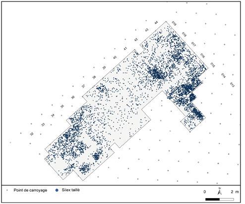 Grâce à l’étude spatiale du positionnement de chaque pièce de silex, au moins sept amas de débitage ont été mis en évidence par les archéologues.