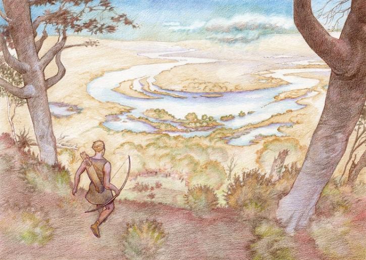 Les données archéologiques permettent de proposer des hypothèses de reconstitutions du paysage d’une époque donnée. Dans notre région, l’environnement mésolithique est dominé par les forêts et en fond de vallée par les marécages (Dessin : P.-Y. Videlier).